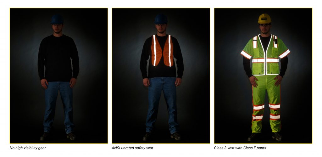 1 Visibilité nocturne : Les vêtements réfléchissants renvoient la lumière émise par des sources telles que les phares des véhicules vers sa source. Ils rendent le porteur visible jusqu'à 300 mètres. Cette visibilité accrue donne aux conducteurs plus de temps pour réagir et réduit les risques d'accident. Les piétons ou les travailleurs sans équipement réfléchissant ne sont visibles qu'à 60 mètres. Cette distance est trop courte pour réagir dans les zones de circulation à grande vitesse, comme les chantiers routiers.